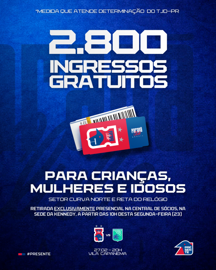 O Paraná Clube informa que, em cumprimento à decisão do Tribunal de Justiça Desportiva do Paraná (TJD-PR), 2.800 ingressos gratuitos serão disponibilizados para mulheres, crianças e idosos para a partida da próxima sexta-feira (27), às 20h, na Vila Capanema, pela estreia do Campeonato Paranaense Série B, diante do Prudentópolis.